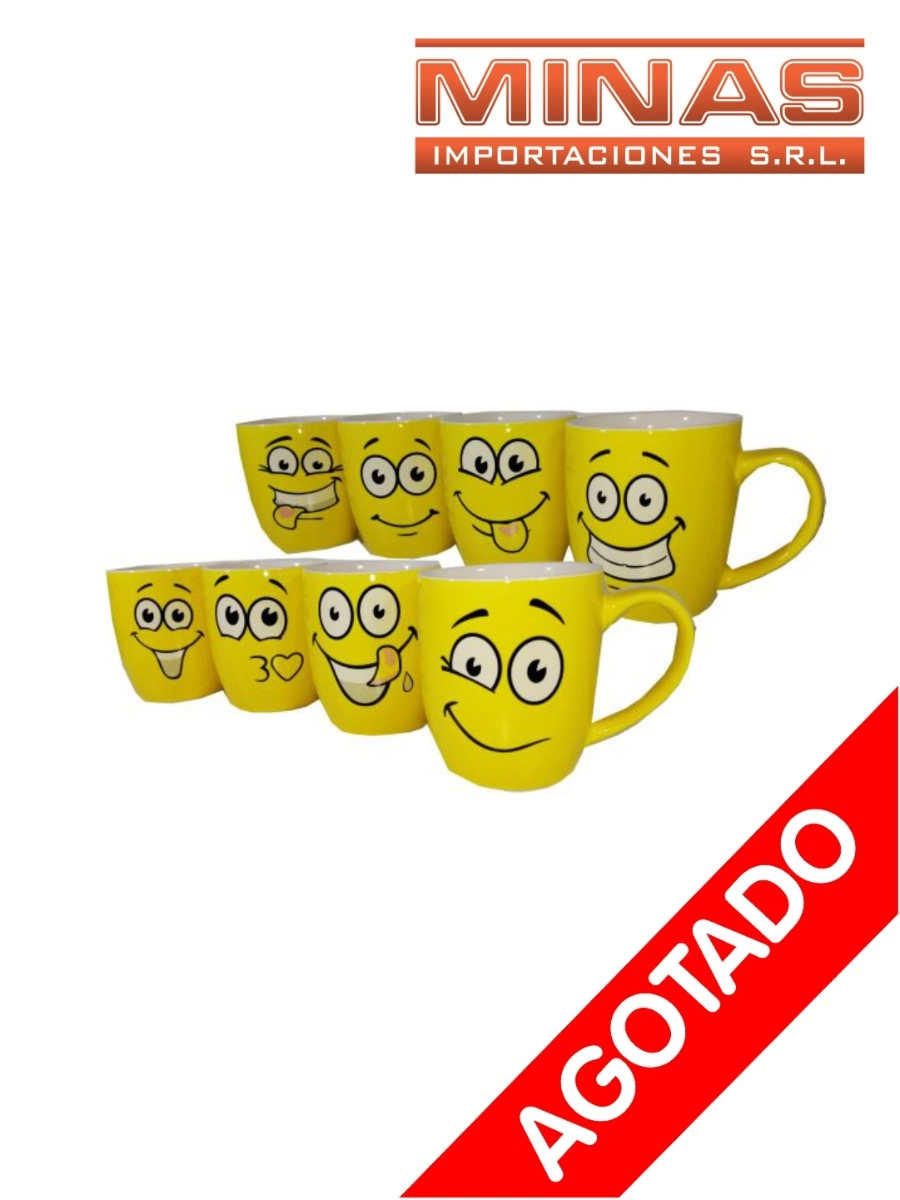TAZA CARITAS AMARILLAS DE 8.5 CM, 8 MODELOS, EN CAJA.