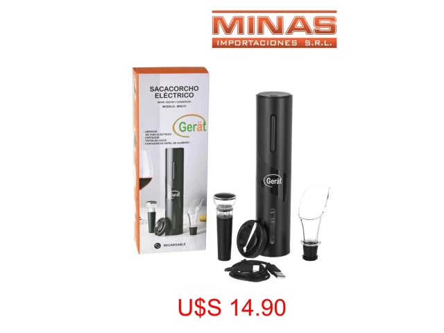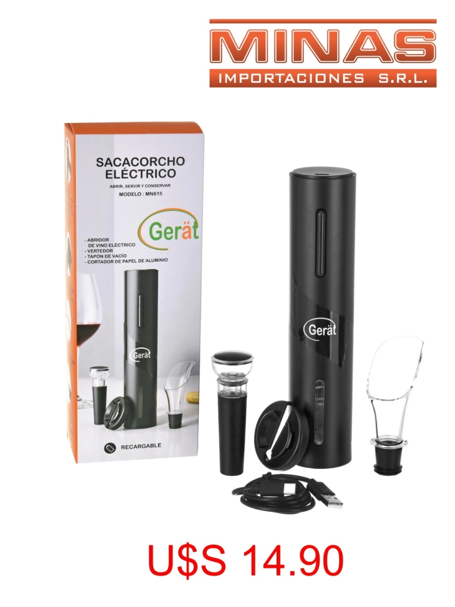 SACACORCHO GERART ELECTRICO RECARGABLE (USB)+ VERTEDOR + TAPON DE VACIO + CORTADOR DE PAPEL DE ALUMINIO.