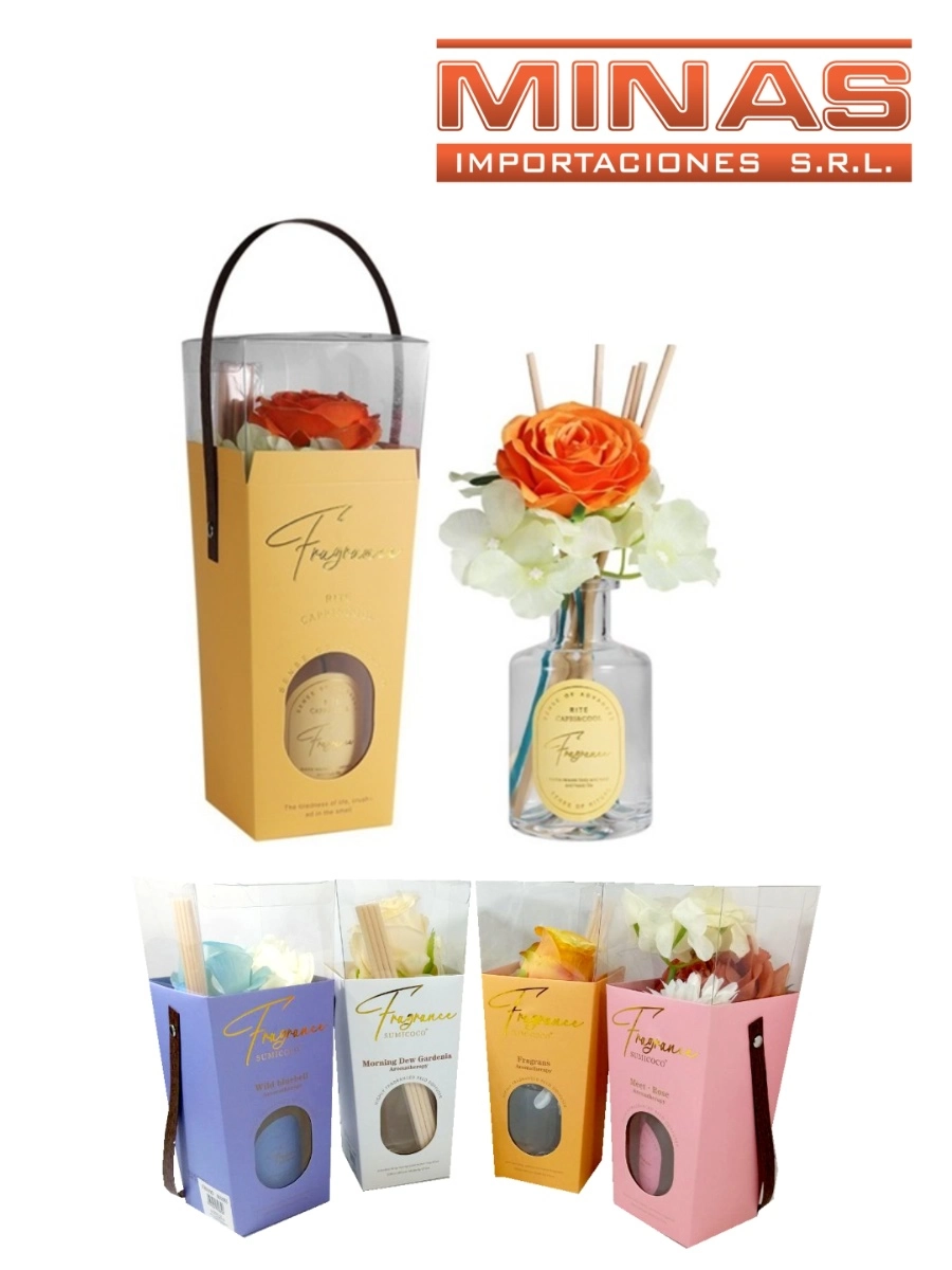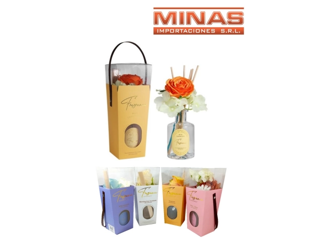 DIFUSOR DE AROMAS X 200 ml, CON FLORES, EN ESTUCHE, 4 AROMAS.